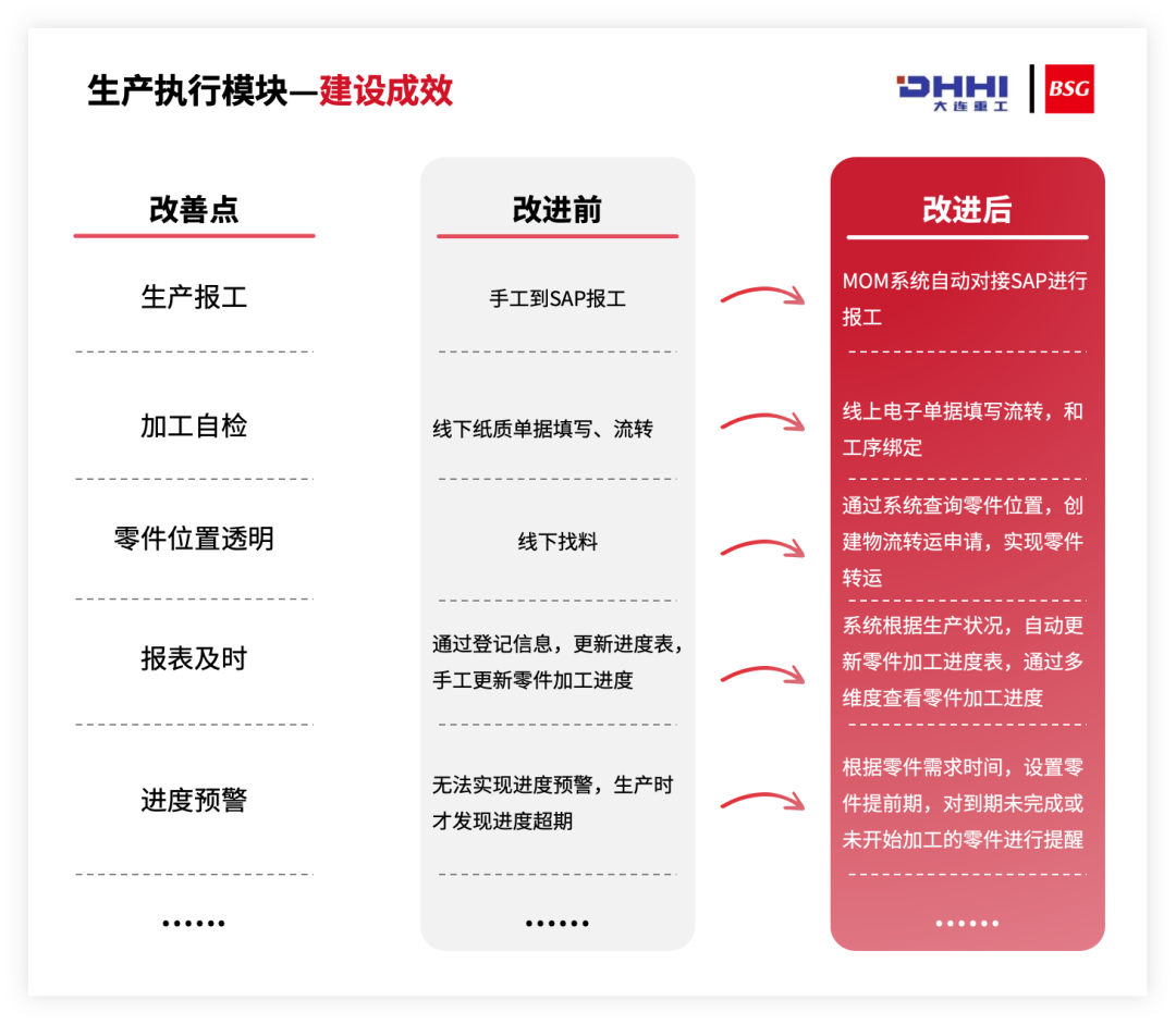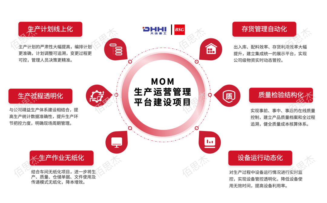 为解决以上难题,佰思杰携手大连重工,共同推进MOM生产运营管理平台建设项目。本次项目的总体目标是围绕国家发展工业互联网和数字化转型的宏观政策,以及大连重工“十四五”战略规划,以精益管理思想为指导,聚焦车间制造过程,为大连重工产品按期成套交付、降本提质增效和精益持续改善提供支撑。具体实现: